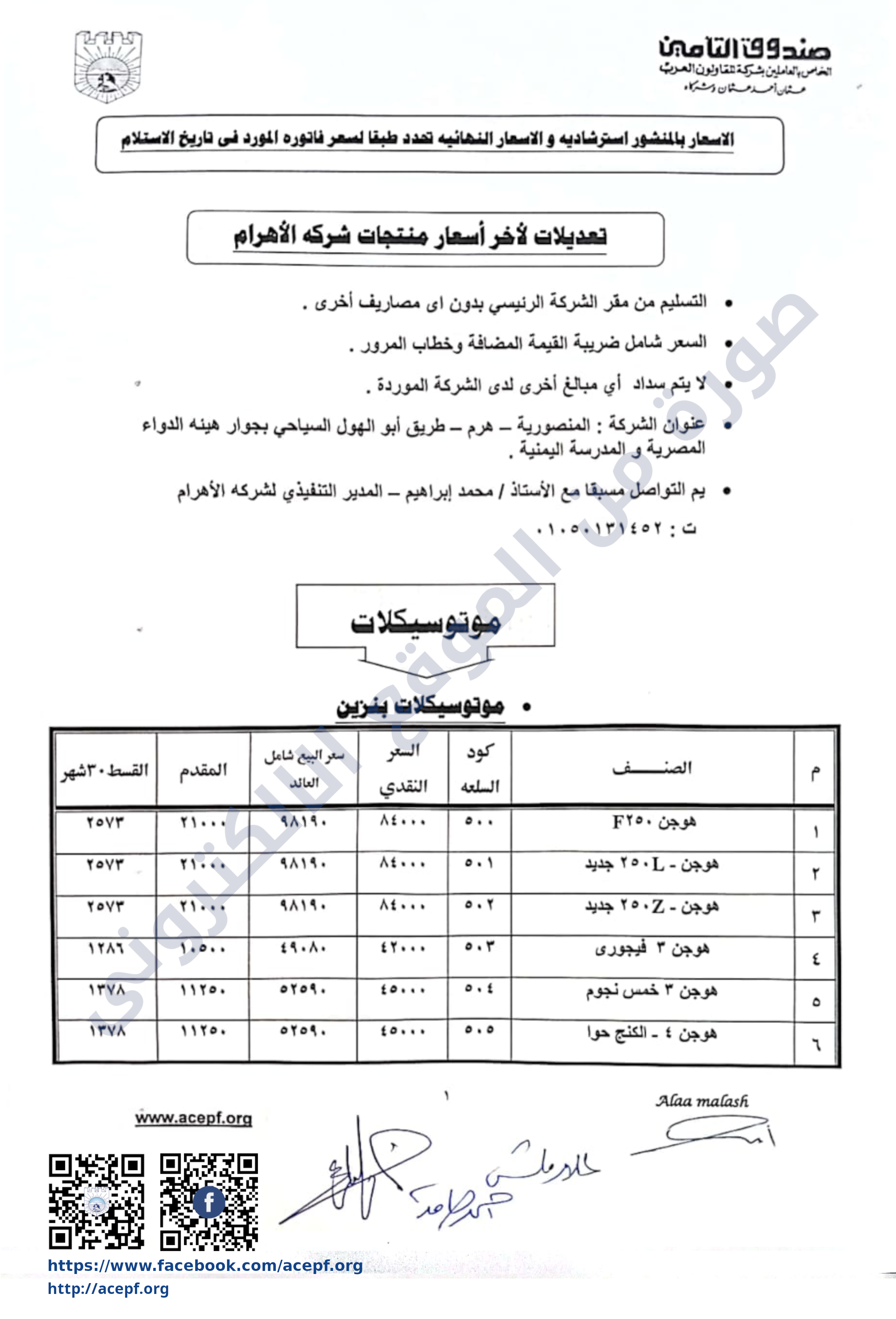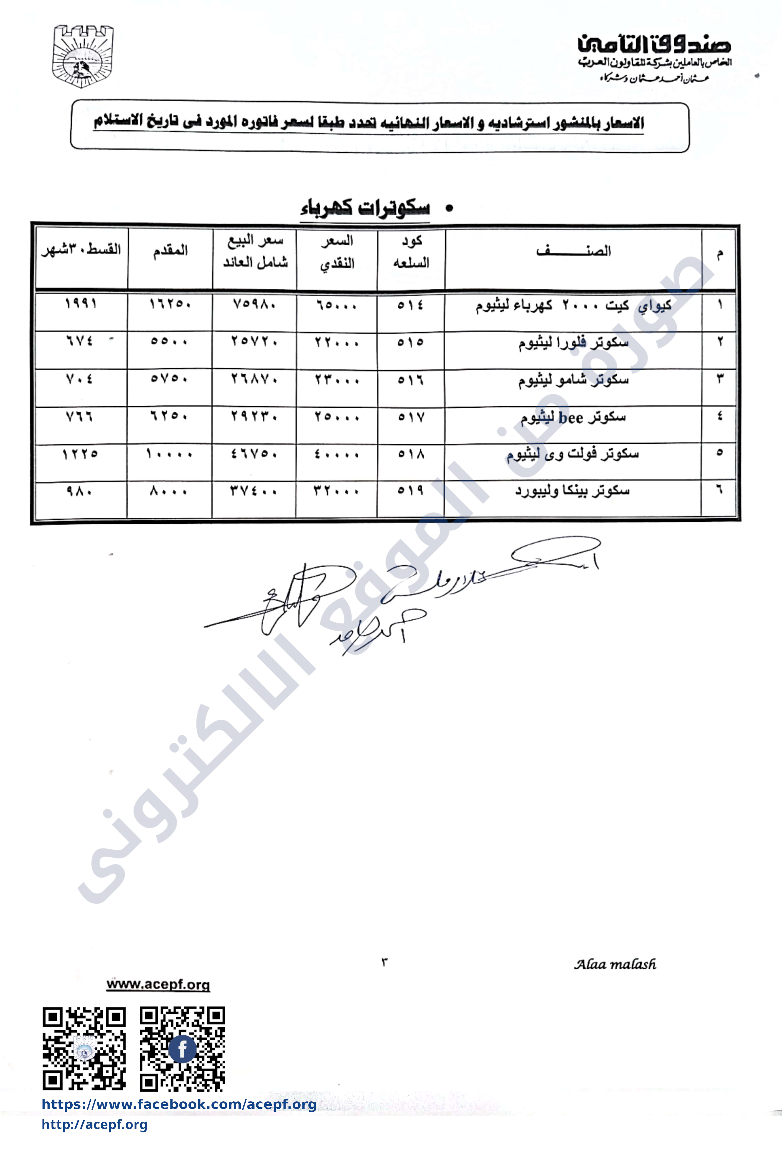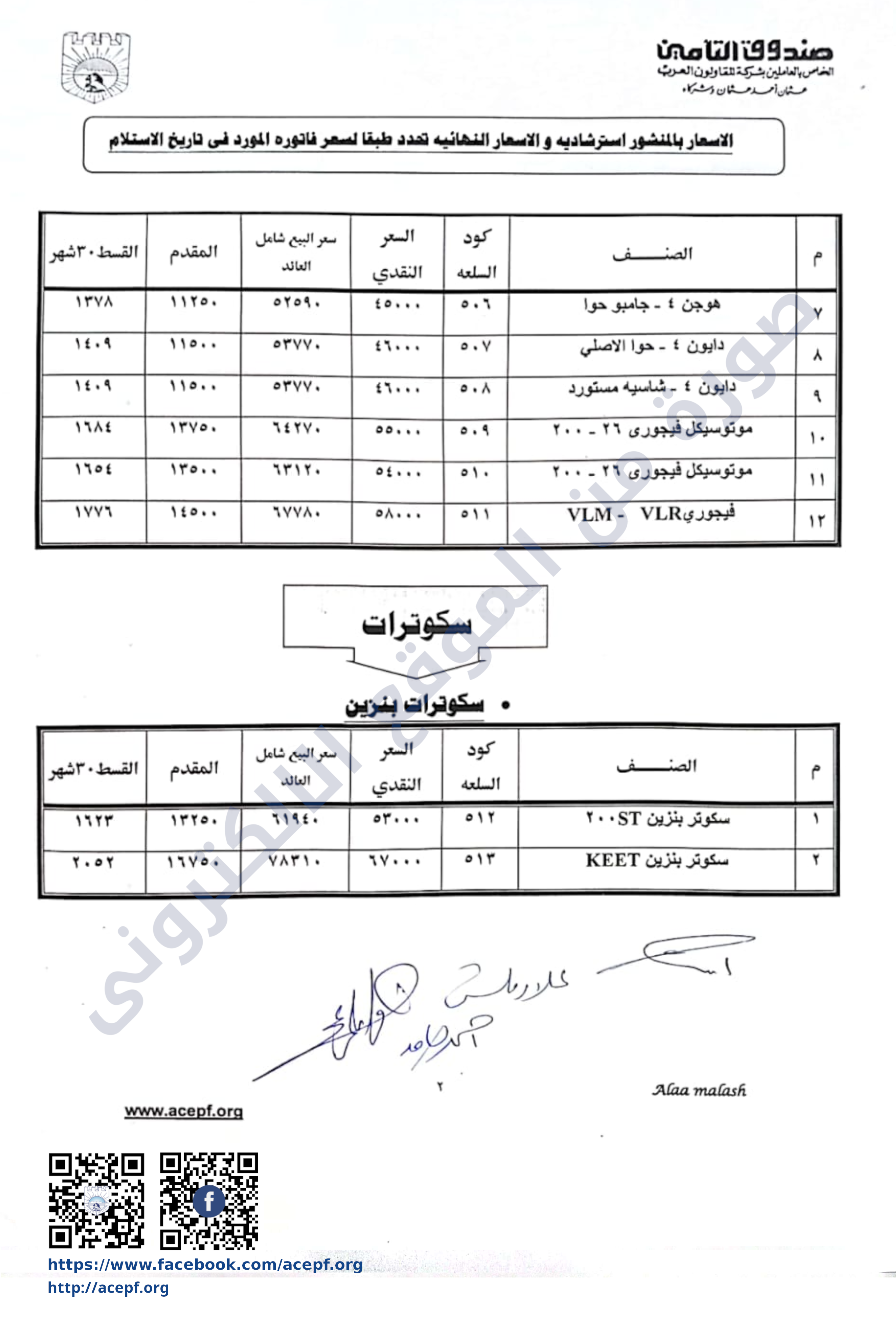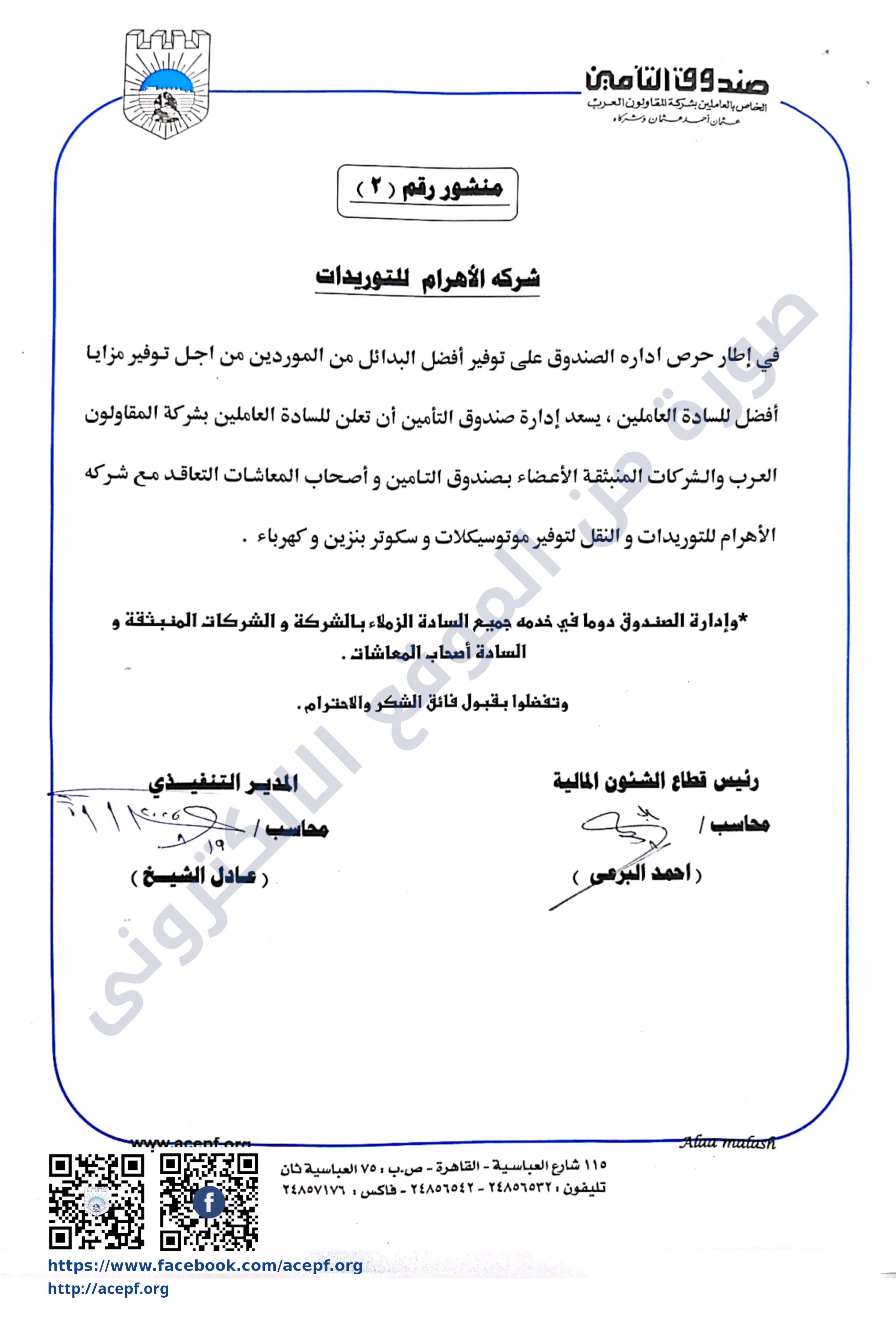 في إطار حرص اداره الصندوق على توفير أفضل البدائل من الموردين من اجل توفير مزايا أفضل للسادة العاملين ، يسعد إدارة صندوق التأمين أن تعلن للسادة العاملين بشركة المقاولون العرب والشركات المنبثقة الأعضاء بصندوق التامين وأصحاب المعاشات التعاقد مع شركه الأهرام للتوريدات والنقل لتوفير موتوسيكلات و سکوتر بنزین و کهرباء.