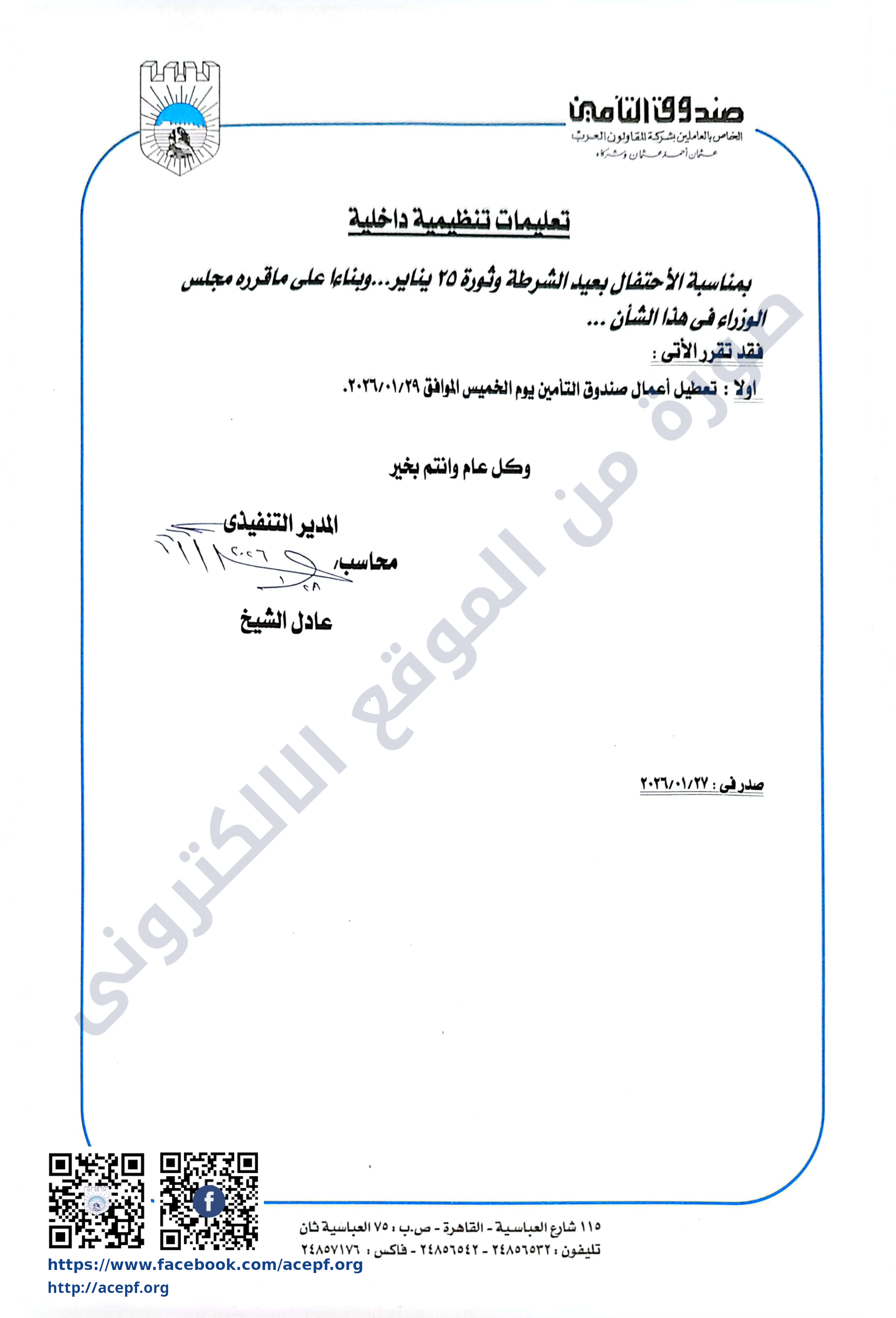 اولا : تعطيل أعمال صندوق التأمين يوم الخميس الموافق ٢٠٢٦/٠١/٢٩
