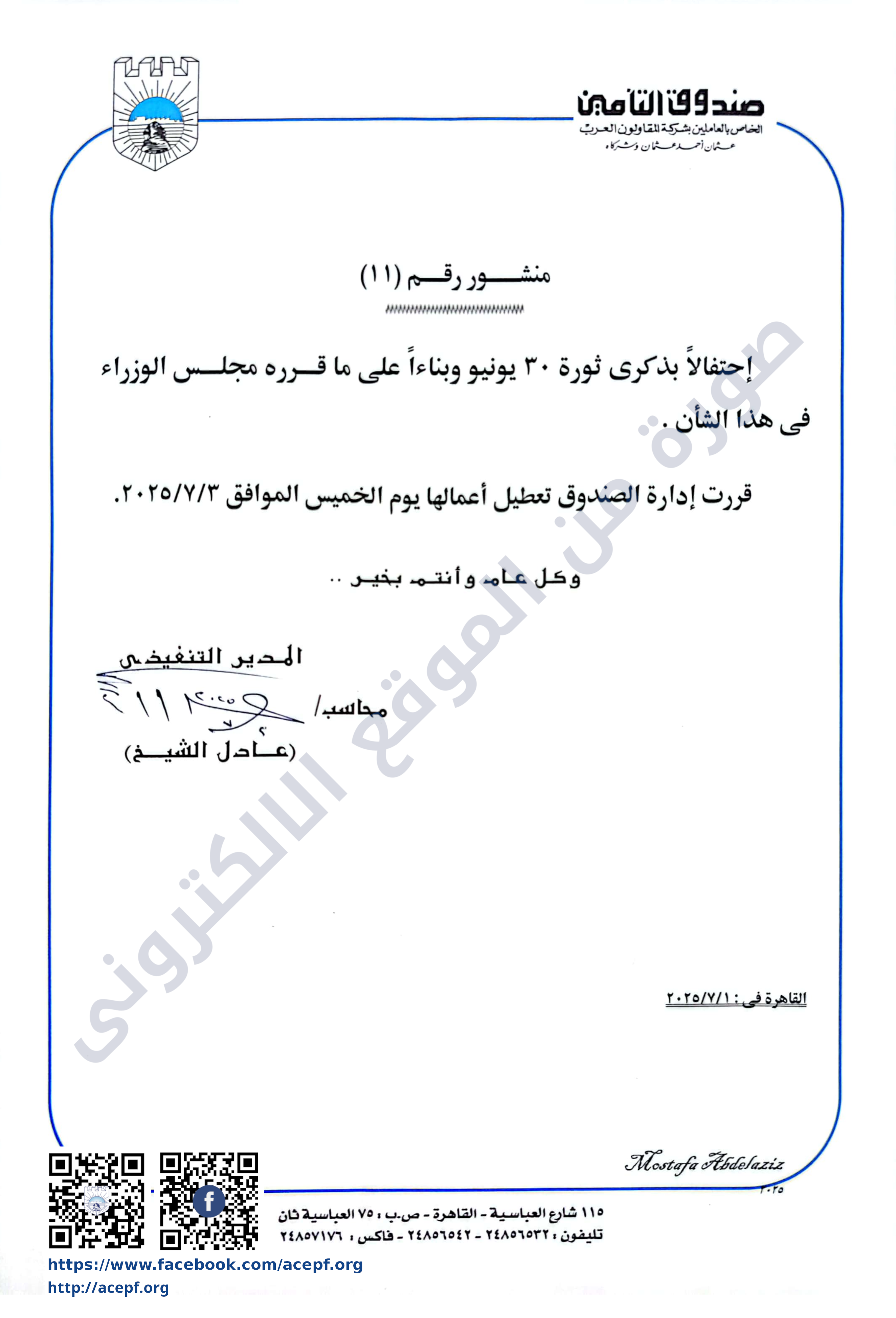 قررت إدارة الصندوق تعطيل أعمالها يوم الخميس الموافق ٢٠٢٥/٧/٣.
