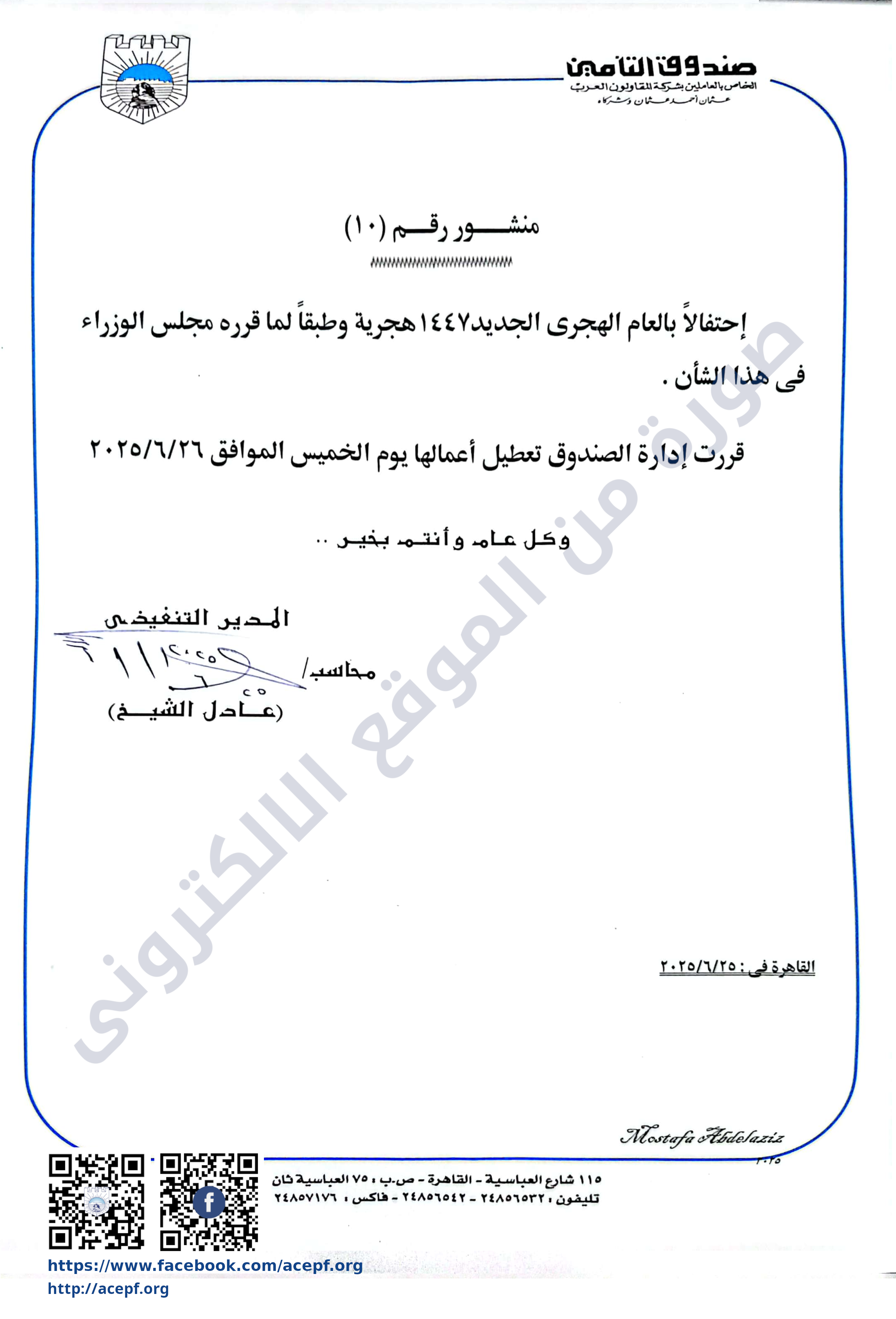 قررت إدارة الصندوق تعطيل أعمالها يوم الخميس الموافق ٢٠٢٥/٦/٢٦.
