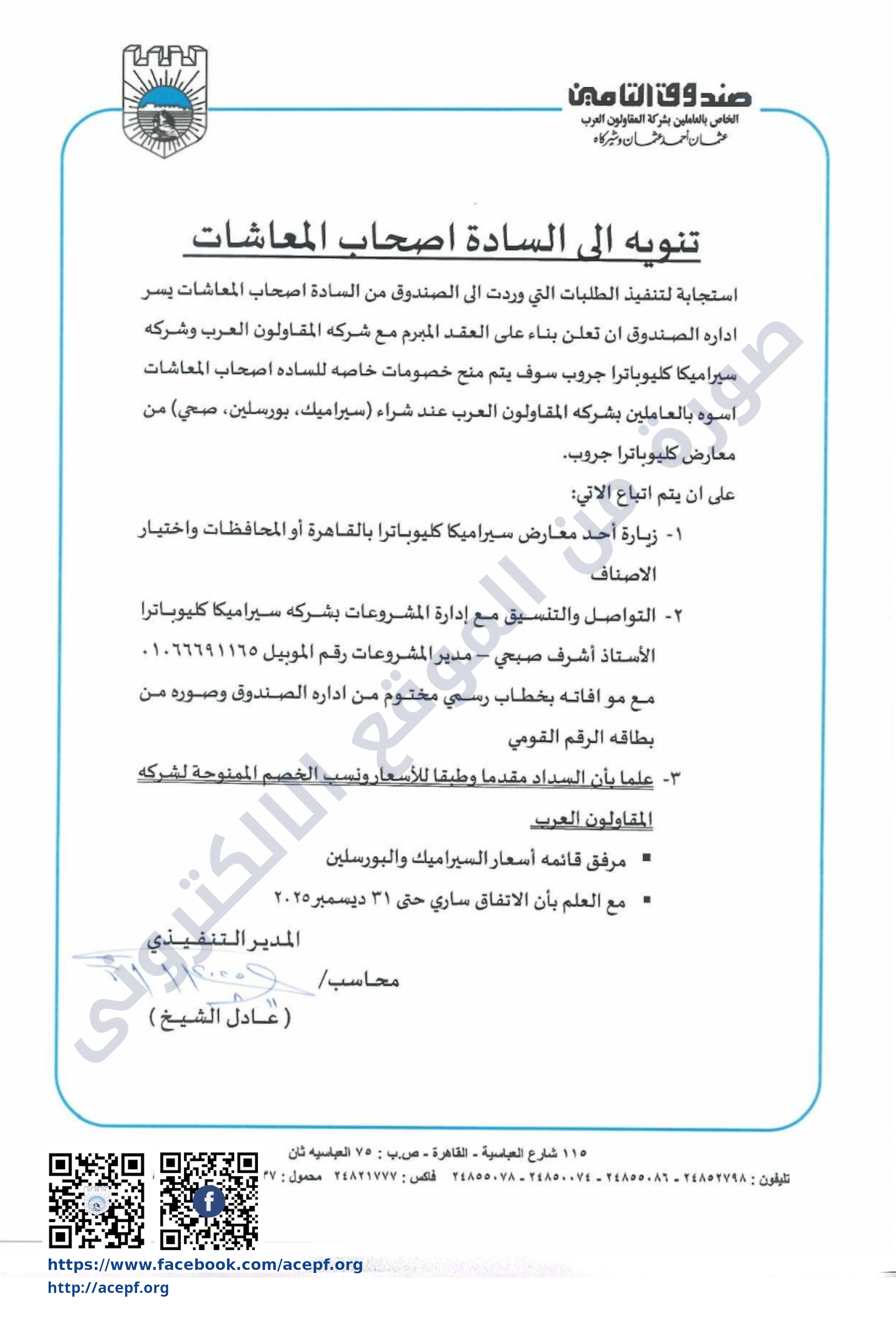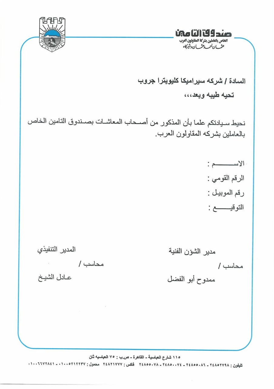 استجابة لتنفيذ الطلبات التى وردت الى الصندوق من السادة اصحاب المعاشات يسر ادارة الصندوق ان تعلن بناء على العقد المبرم مع شركة المقاولون العرب وشركة سيراميكا كليوباترا جروب سوف يتم منح خصومات خاصة للسادة اصحاب المعاشات اسوة بالعاملين بشركة المقاواون العرب عند شراء (سيراميك - بورسلين - صحي) من معارض كليوباترا جروب.