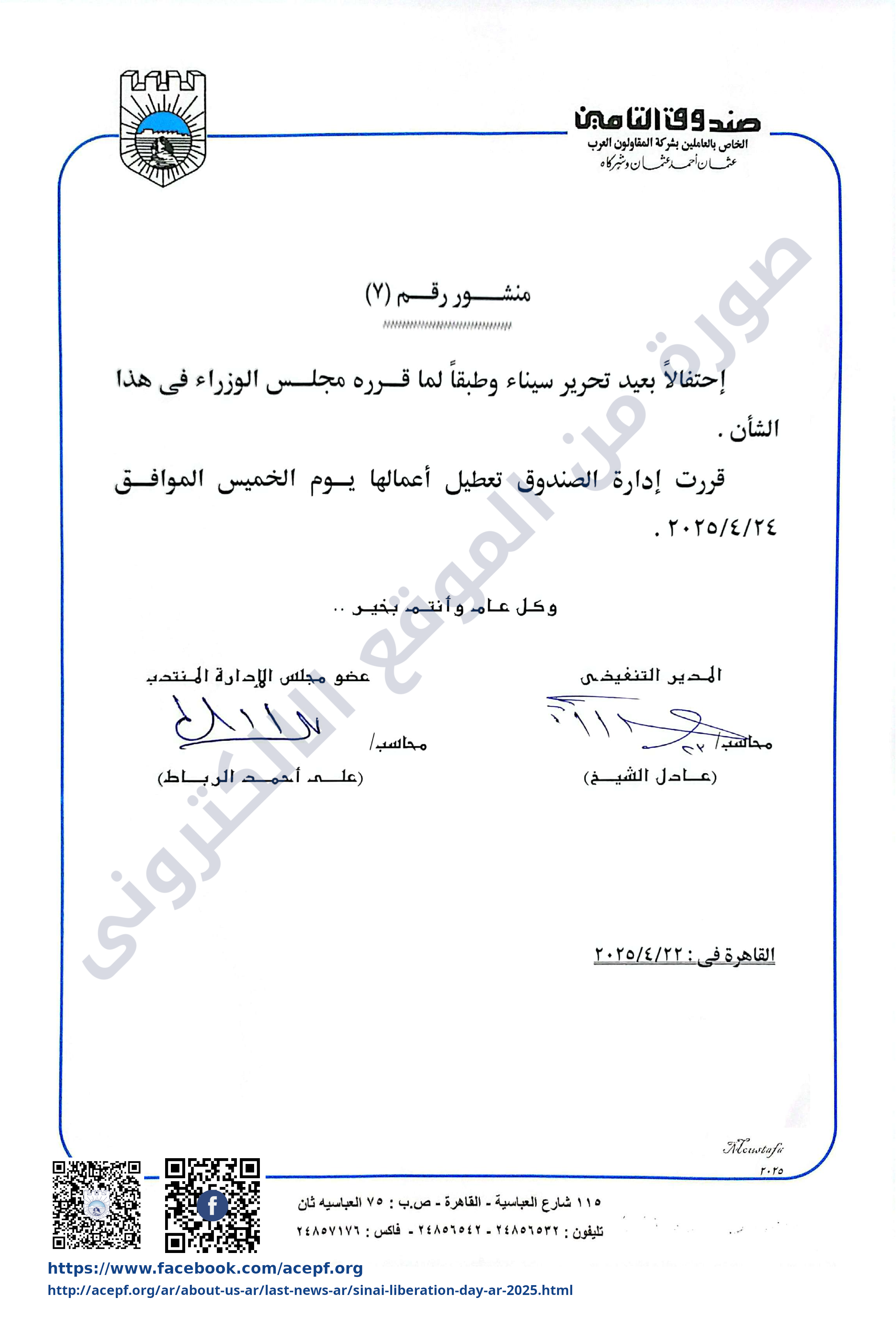 قررت إدارة الصندوق تعطيل أعمالها يوم الخميس الموافق ٢٠٢٥/٤/٢٤ .