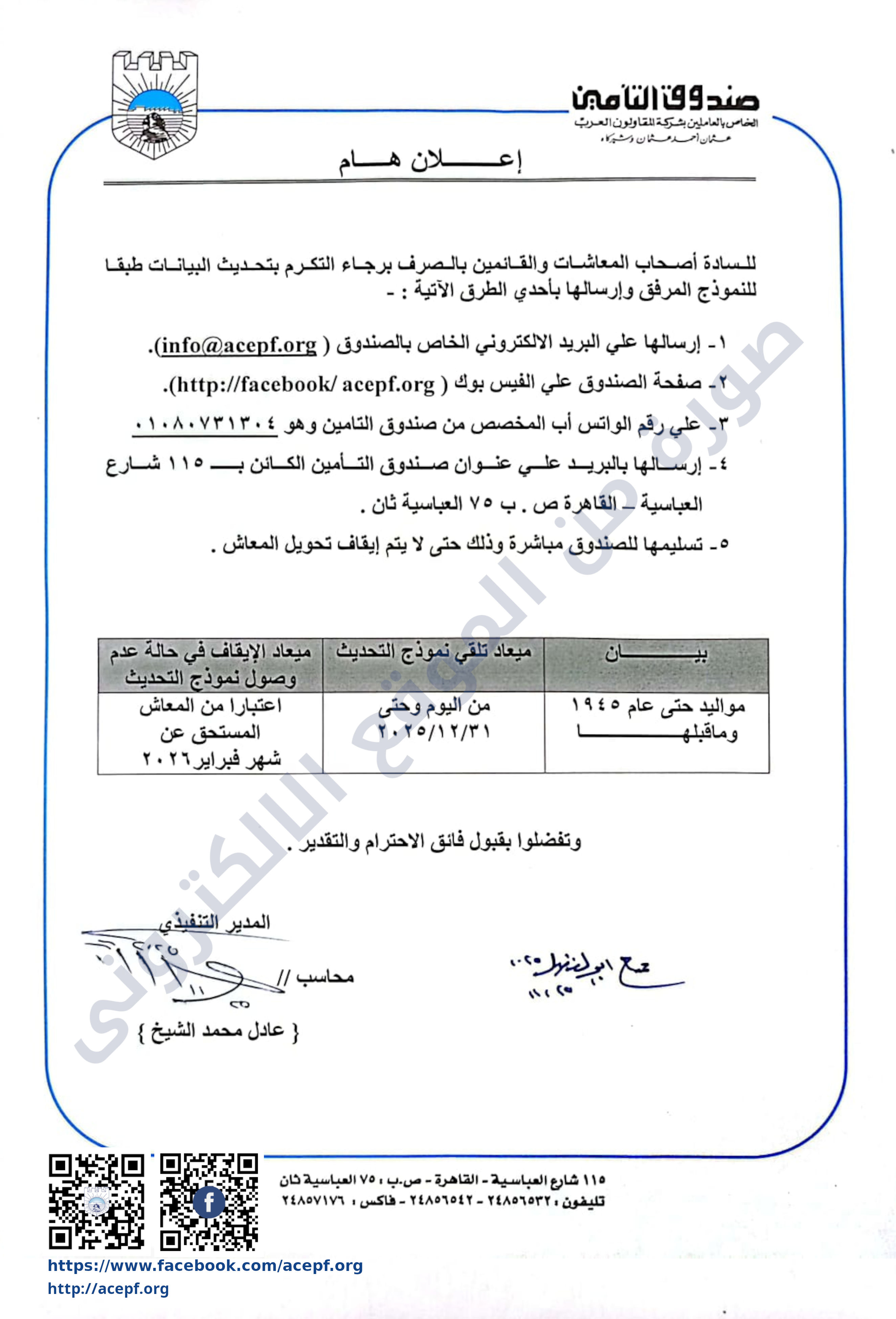 السادة اصحاب المعاشات والمستفيدين لكل من بلغ سن الـ 80 فأكثر هو المنوط بتحديث البيانات فى الوقت الحالى