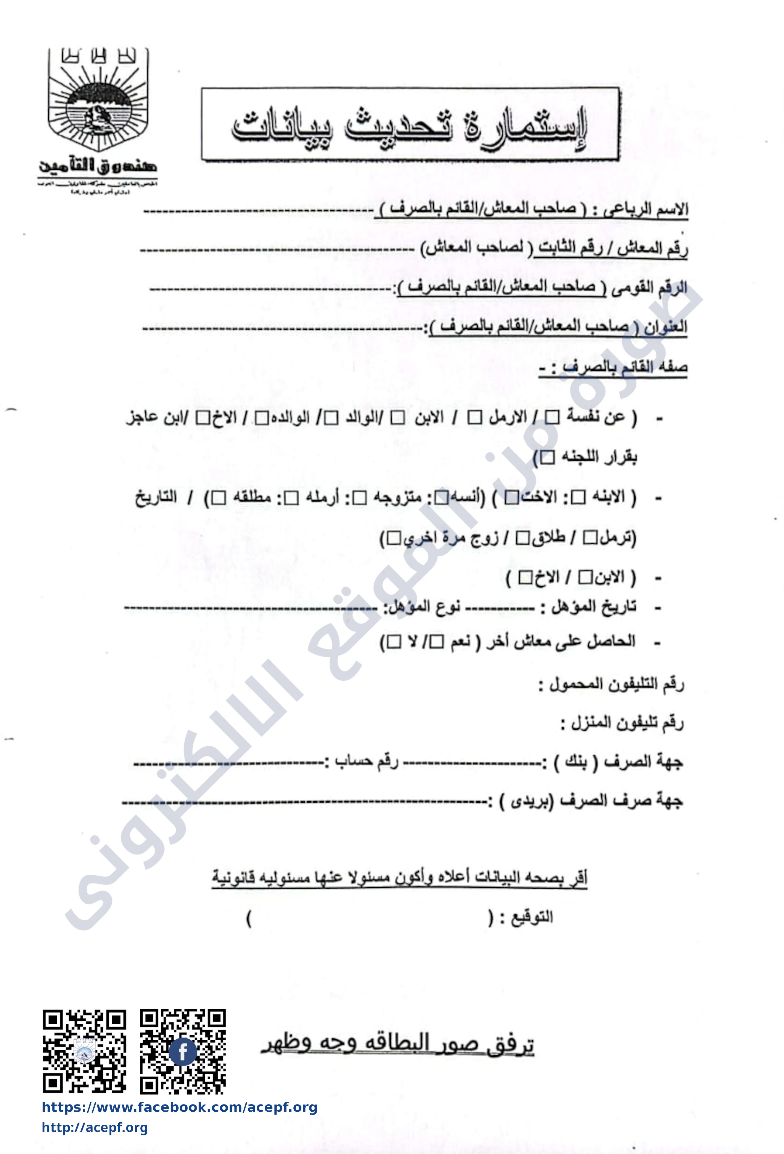 للسادة أصحاب المعاشات والقائمين بالصرف برجاء التكرم بتحديث البيانات طبقا للنموذج المرفق وإرسالها بأحدي الطرق الآتية :