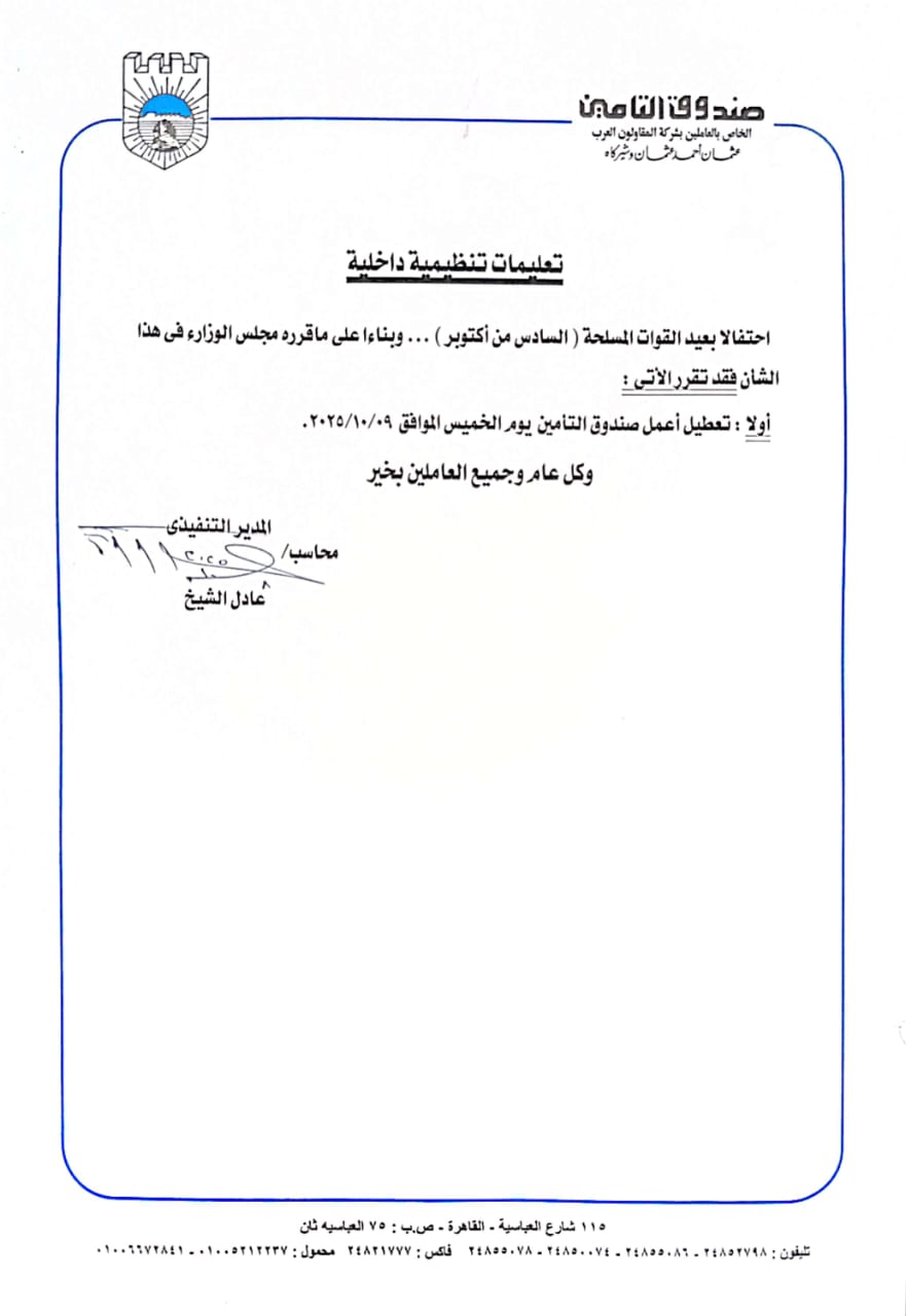 أولا : تعطيل أعمال صندوق التأمين يوم الخميس الموافق ٢٠٢٥/١٠/٠٩.